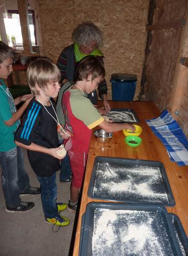 Für das Frühstück am nächsten Morgen buken und batschten, schüttelten und schnitten, rührten und rieben, mahlten und machten die Kinder Mehl, Brötchen, Aprikosen-Marmelade, Butter und Haferflocken Nach dem Abendessen gab es noch Stockbrot mit Nutella und Marsh-Mellows.