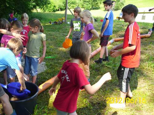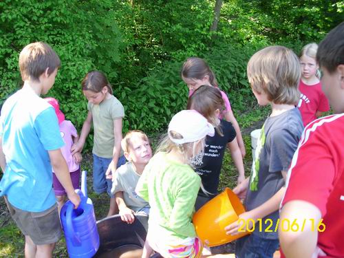 barfuß über Lärchenzapfen, Steine, Sand, Laub, Moos, auch Schlamm und eiskaltes Wasser kein Problem für die Kinder. Ein Erlebnis für die Füsse verschiedene Untergründe hautnah mit den Sohlen fühlen. Die Erweiterung der Matschzone, Bau einer Wasserleitung sowie die Waschung der Füsse standen zum Abschluss noch auf dem Programm.
