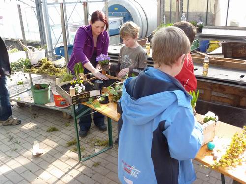 Woher kommen die Geranien? Wie werden Salat und Co. herangezogen? Wie kann man umweltfreundlich und sparsam wässern? Und wie funktioniert Schädlingsbekämpfung ganz natürlich ohne Chemie? Diese und andere Fragen wurden im zertifizierten Bio-Gartenbaubetrieb beantwortet. Danach wurden Hasen gebastelt, eine Ostereierjagd durchgeführt und als Maulwurf durch die Hügel gestochert. Die selbst dekorierten Osterkisten wurden zudem noch mit Frühlingsblumen bepflanzt, die Familie Böhringer gestiftet hat. Von Anfang bis Ende ein gelungener Frühlingsauftakt.