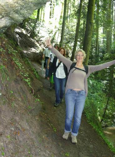 Während eine kleine Gruppe das Städtische Museum des Historischen Vereins besichtigte, machte sich ein wagemutiges Trüpplein auf, mittlerweile bei Sonnenschein auf dem Mühlenweg durch die Edenbachschlucht zur Laufenmühle zu wandern. Nachdem der abenteuerliche, schlammig–rutschige Abstieg mit viel Gelächter und Gejohle und so manchem Ausrutscher gemeistert war, konnte die Idylle auf dem Bachweg genossen werden.
