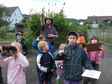 Im Rahmen der “Stunde der Gartenvögel” zog immer eine Gruppe los, Vögel mit Ferngläsern zu entdecken und Vogelstimmen zu erkennen. Einige “Profis” unter den Kleinen kennen schon viele heimische Vogelarten sicher. Ihre Ergebnisse trugen sie in Beobachtungskarten ein.