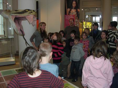 In der aktuellen Ausstellung “Schlangenlinien” konnten viele ausgestopfte, aber auch lebende, heimische und exotische Exemplare des sagenumwobenen Reptils bewundert werden, so auch ein ehemaliger Bewohner der Wilhelma, Thommy, eine männliche Tigerpython mit fast 300 Rippenbögen. Die Kinder konnten anhand von Videos und Modellen sehen, wie Schlangen ihre Beute töten, indem sie sie erwürgen oder vergiften.
