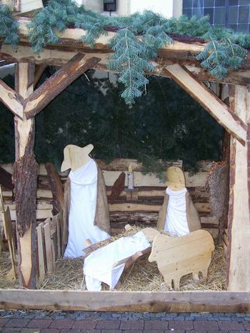 Die Kirchenmauer verziert mit einem großzügigen Stall mit nahezu lebensgroßen Figuren, beeindruckend durch schlichte Formen.